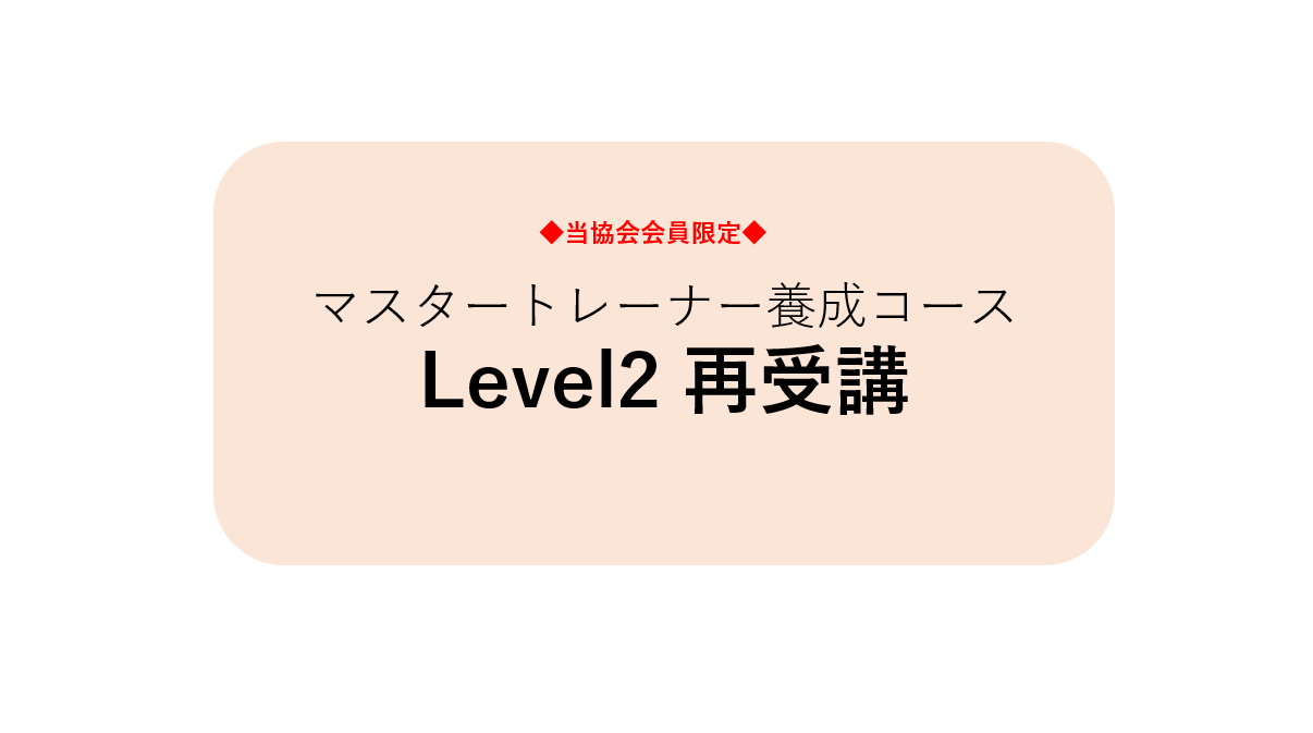マスタートレーナー養成コースLevel2 再受講の申込画面です。 受講した場合、更新単位付与します。 新テキストは別途有償となります。必要な方は、会員サイト内のオンラインショップからお申込みください。